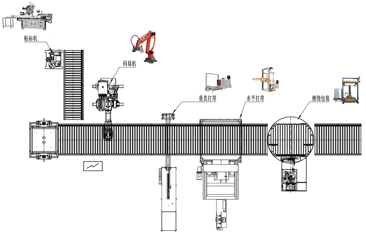 工藝流程為: 全自動灌裝包裝系統(tǒng)-定量包裝稱-自動縫包機-倒袋整平機-爬坡輸送機-金屬檢測儀-重量檢測儀-剔除機托盤庫-碼垛機器人-搖臂纏繞機-出貨