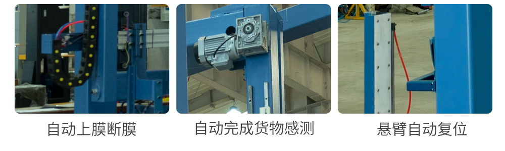 自動識別,自動啟動,自動上膜斷膜,包裝完畢自動輸送至等待位,等待叉車卸貨