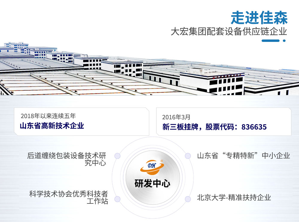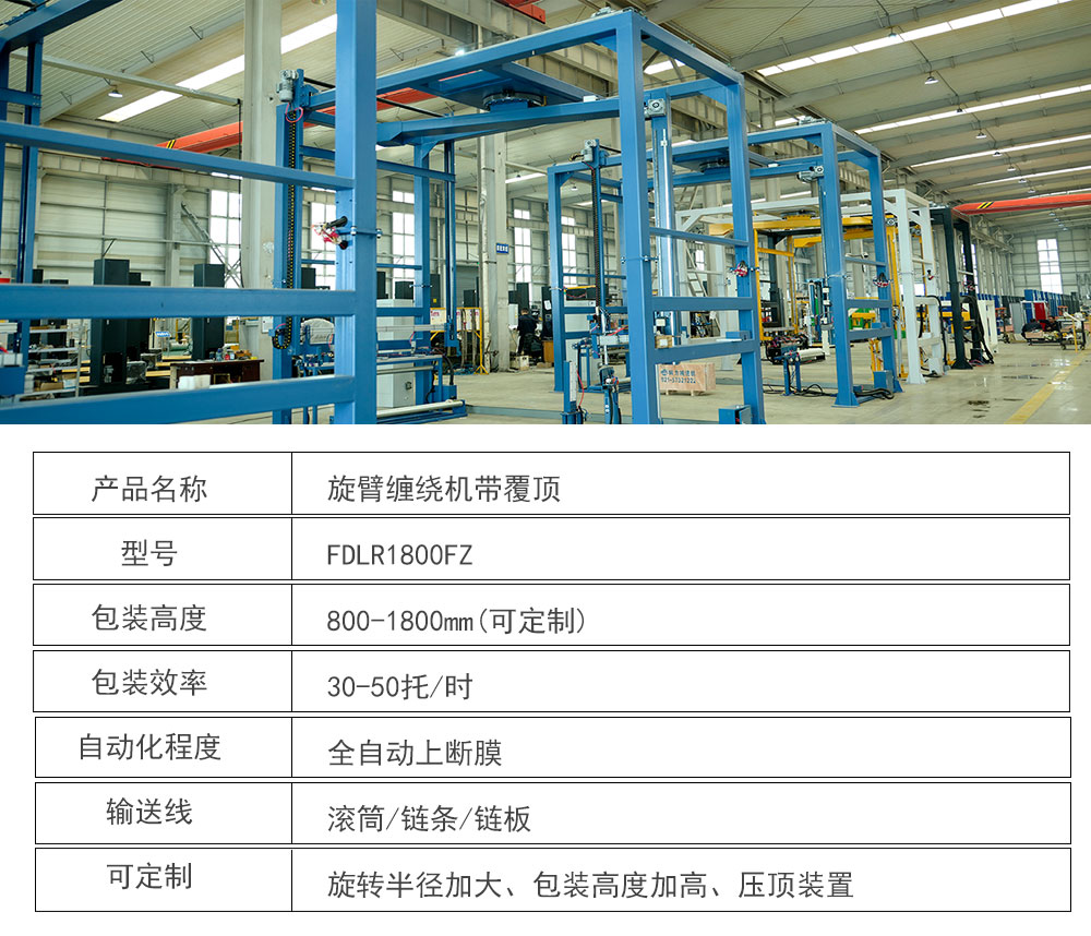 大宏佳森旋臂纏繞機帶覆頂FDLR1800FZ主要適用于生產量大、包裝效率較高的現代化作業,包裝成本低、效率高滿足貨物的包裝要求。可根據不同的產品和現場的實際需求,定制不同的包裝系統,自動完成貨物的感測、包裝輸送等全過程,輸送系統可采用滾筒、鏈條、鏈板等不同的形式,自動上斷膜機構可實現無人化操作廣泛應用于食品、飲料、化工、造紙、建材等行業。
